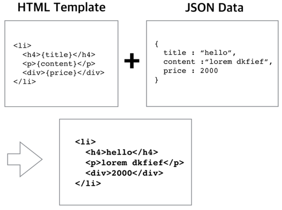 - 반복적인 HTML부분을 template(포맷, 양식)으로 만들어두고, 서버에서 온 데이터(주로JSON)을 결합해서, 화면에 동적으로 추가하는 작업이라고 할 수 있습니다.