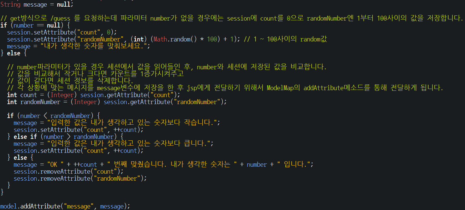 // number파라미터가 있을 경우 세션에서 값을 읽어들인 후, number와 세션에 저장된 값을 비교합니다. // 값을 비교해서 작거나 크다면 카운트를 1증가시켜주고 // 값이 같다면 세션 정보를 삭제합니다. // 각 상황에 맞는 메시지를 message변수에 저장을 한 후 jsp에게 전달하기 위해서 ModelMap의 addAttribute메소드를 통해 전달하게 됩니다. int count = (Integer)session.getAttribute("count"); int randomNumber = (Integer)session.getAttribute("randomNumber");