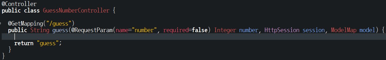 @GetMapping("/guess") public String guess(@RequestParam(name="number", required=false) Integer number, HttpSession session, ModelMap model) {