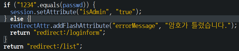 if("1234".equals(passwd)) { session.setAttribute("isAdmin", "true"); }else { redirectAttr.addFlashAttribute("errorMessage","암호가 틀렸습니다."); return "redirect:/loginform"; } return "redirect:/list"; }