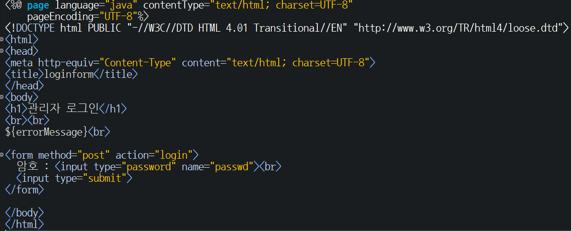 <%@ page language="java" contentType="text/html; charset=UTF-8" pageEncoding="UTF-8"%> <!DOCTYPE html PUBLIC "-//W3C//DTD HTML 4.01 Transitional//EN" "http://www.w3.org/TR/html4/loose.dtd"> <html> <head> <meta http-equiv="Content-Type" content="text/html; charset=UTF-8"> <title>loginform</title> </head> <body> <h1>관리자 로그인</h1> <br><br> ${errorMessage}<br>