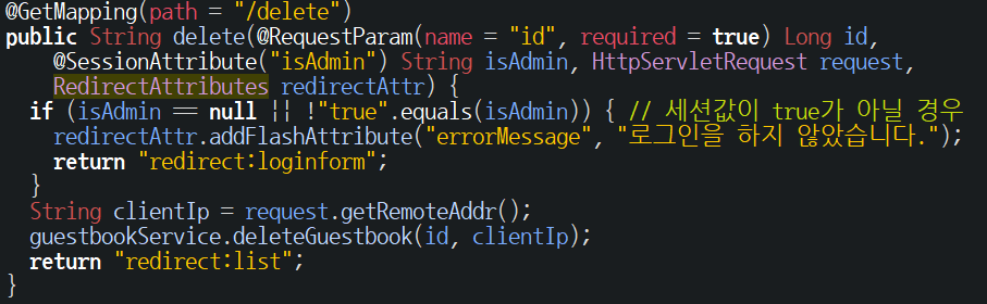 //delete @GetMapping(path="/delete") public String delete(@RequestParam(name="id", required=true) Long id, @SessionAttribute("isAdmin") String isAdmin, HttpServletRequest request, RedirectAttributes redirectAttr) { if(isAdmin == null || !"true".equals(isAdmin)) { // 세션값이 true가 아닐 경우 redirectAttr.addFlashAttribute("errorMessage", "로그인을 하지 않았습니다."); return "redirect:loginform"; } String clientIp = request.getRemoteAddr(); guestbookService.deleteGuestbook(id, clientIp); return "redirect:list"; } } |