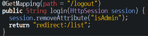 @GetMapping(path="/logout") public String login(HttpSession session) { session.removeAttribute("isAdmin"); return "redirect:/list"; } } |