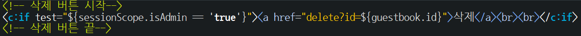 ${guestbook.id }<br> ${guestbook.name }<br> ${guestbook.content }<br> ${guestbook.regdate }<br> <!-- 삭제 버튼 시작--> <c:if test="${sessionScope.isAdmin == 'true'}"><a href="delete?id=${guestbook.id}">삭제</a><br><br></c:if> <!-- 삭제 버튼 끝--> </c:forEach> <br>