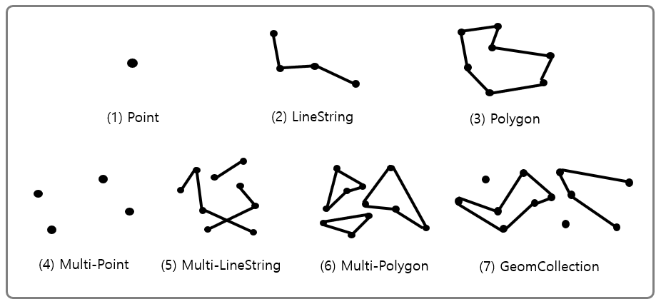 | GeomCollection | 모든 공간 데이터들의 집합 | GEOMETRYCOLLECTION ( POINT (10 10), LINESTRING (20 20, 30 40), POINT (30 15) ) |
